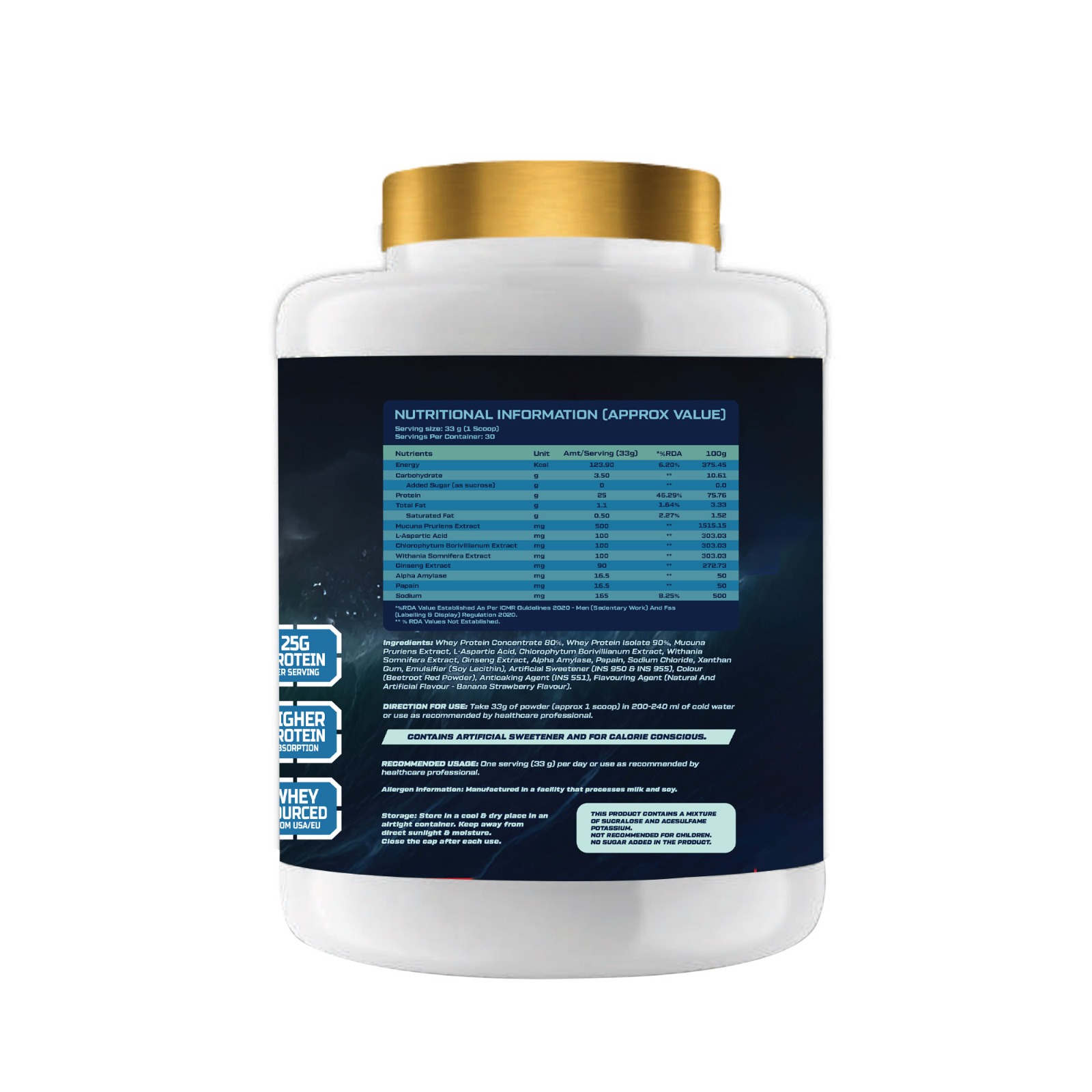 Each serving delivers 25g of high-quality whey protein, helping repair muscles, build lean mass, and support faster recovery after intense workouts.